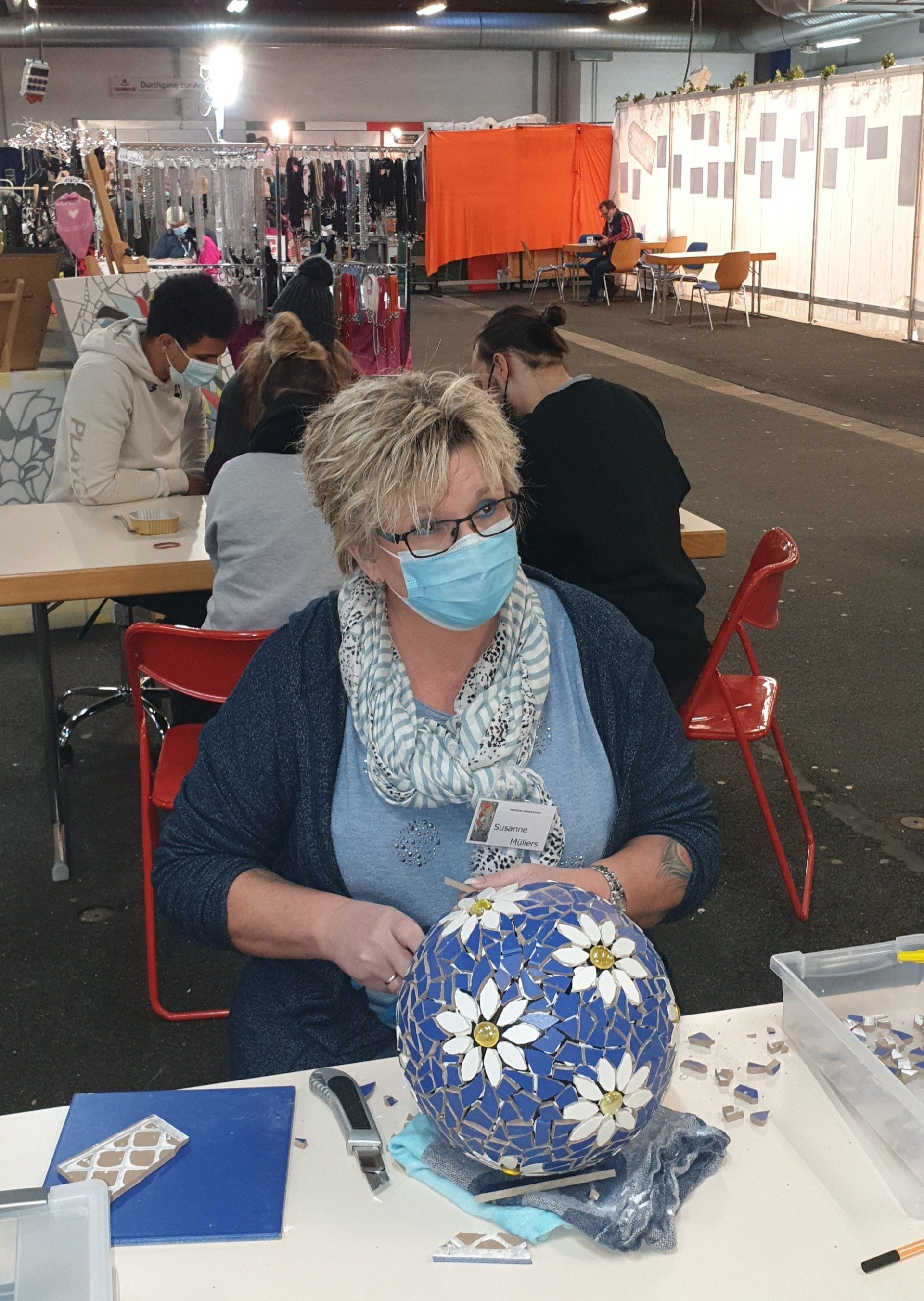 An unserem Stand konnte man unserer Susanne beim mosaiken zusehen. Sie gestaltete eine Kugel. Als Grundlage diente hier eine alte Bowlingkugel welche mit einem floralen Mosaik verziert wurde.