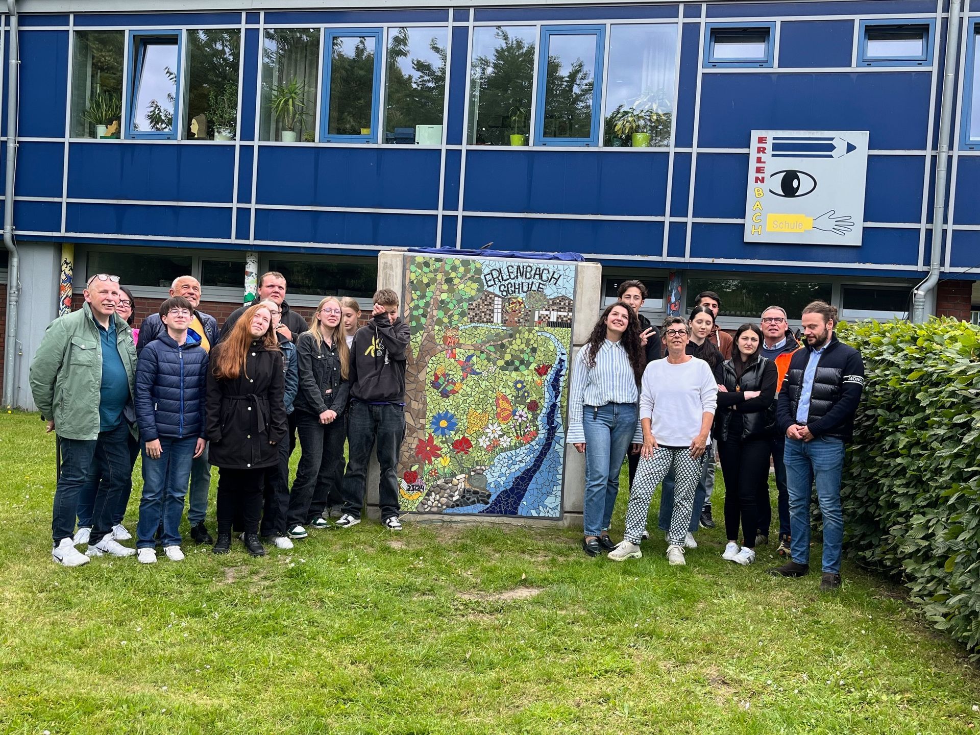 Am 12.06.2024 war es endlich soweit, das erarbeitete Mosaik wurde feierlich eingeweiht. Die Presse, Herr Bernd Kühler vom Kulturbüro der Stadt Hamm sowie Herr Schneider (Fa. Hugo Schneider, Sponsor der Mauer) erschienen und gratulierten den Schüler:innen zu dem gelungenen Kunstwerk.