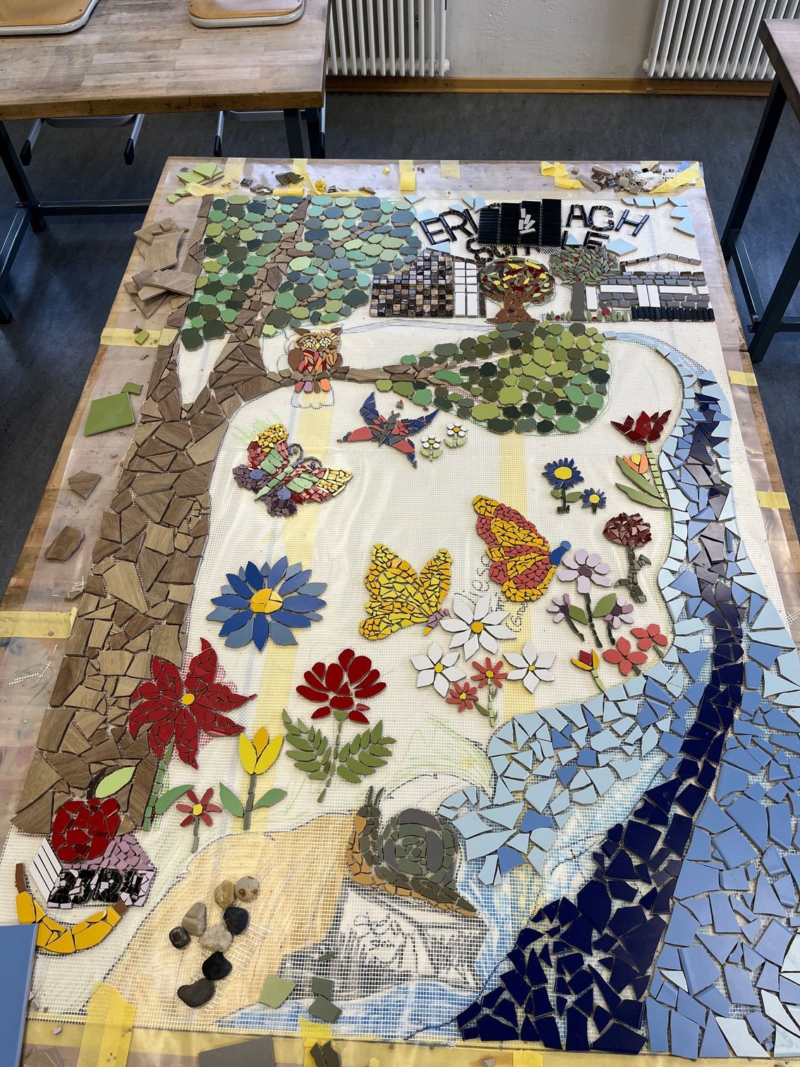 Eingangs unseres Kurses wurde also der Entwurf gefertigt, währenddessen haben sich die Schüler:innen aber schon mit kleinen Mosaikarbeiten befasst und gelernt die Fliese in Form zu kriegen. Erarbeitet wurden einzelne kleine Blumen, Schmetterlinge und vieles mehr. Als der große Entwurf dann endlich für unsere Gemeinschaftsarbeit auf dem Tisch lag, konnten wir sodann unsere kleinen bereits erarbeiten Mosaike umlegen und einbringen. Nun hieß es, den Hintergrund und die großen Motive (Baum, Bach und Schulgebäude zu erarbeiteten). Dies geschah in absoluter Gemeinschaftsarbeit.