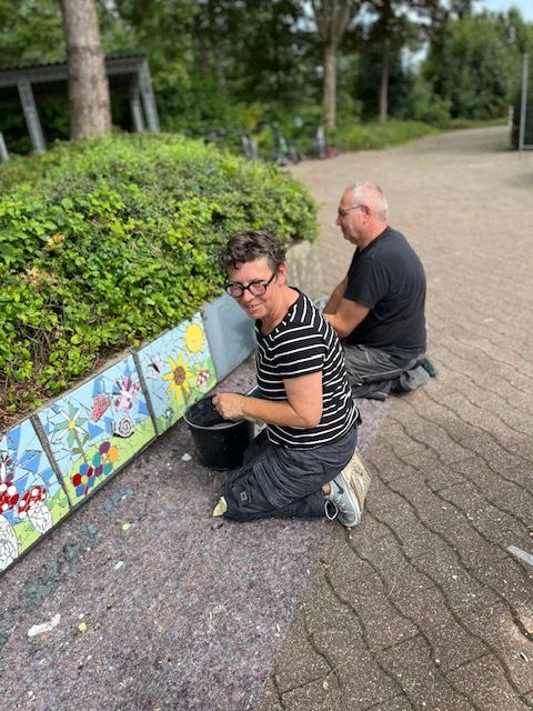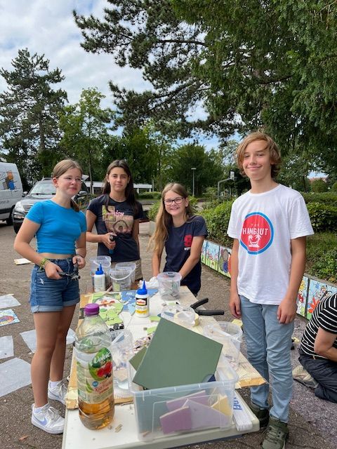 Die Schüler:innen haben bis zum letzten Kurstermin vor den Sommerferien 2023 Mosaike für den Schulhof erstellt. Insgesamt sind 37 wunderschöne Platten entstanden.