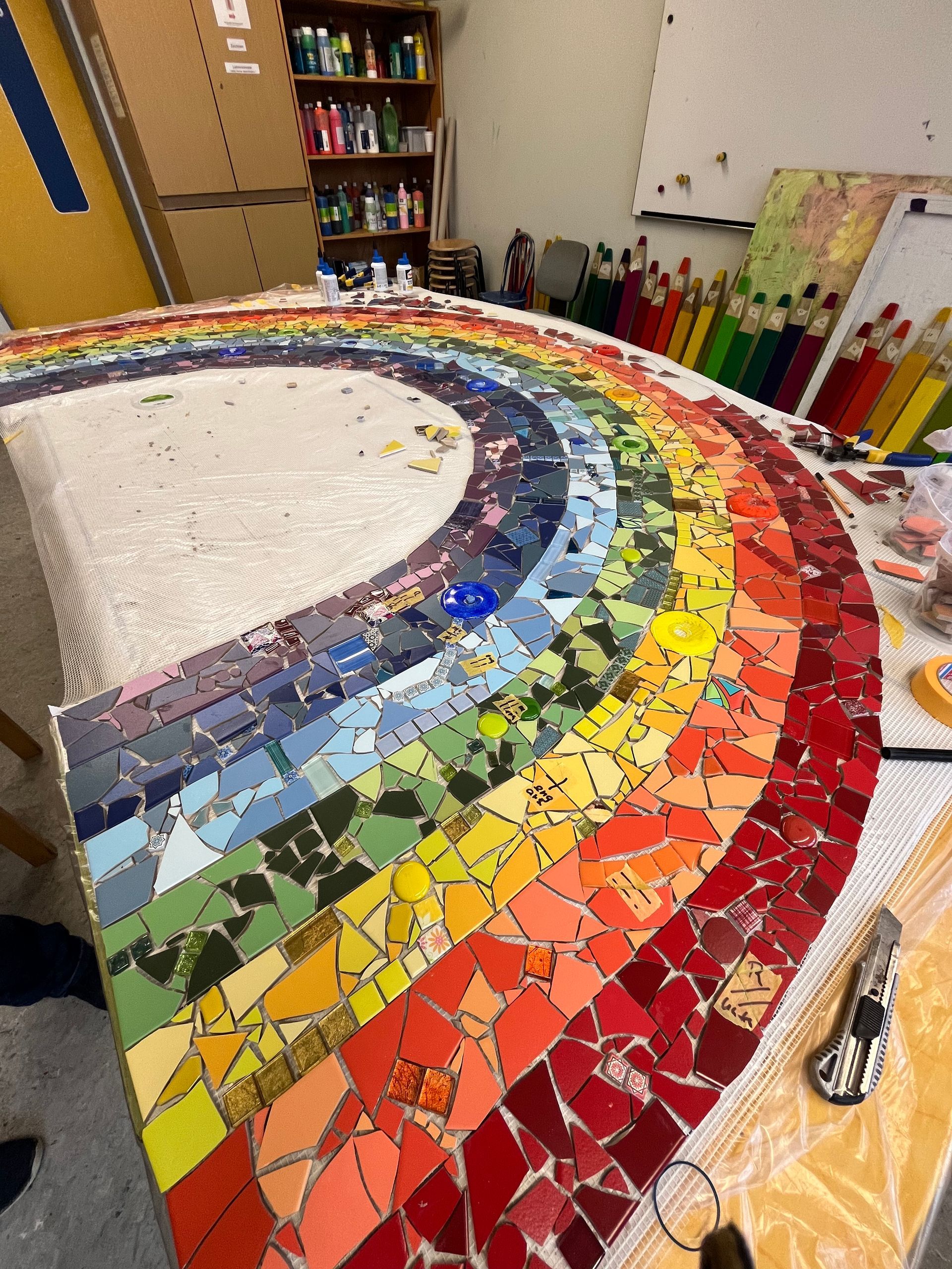 Verziert wurden Gläser, alte CDs und auch das eigene Logo wurde in Mosaik umgesetzt.