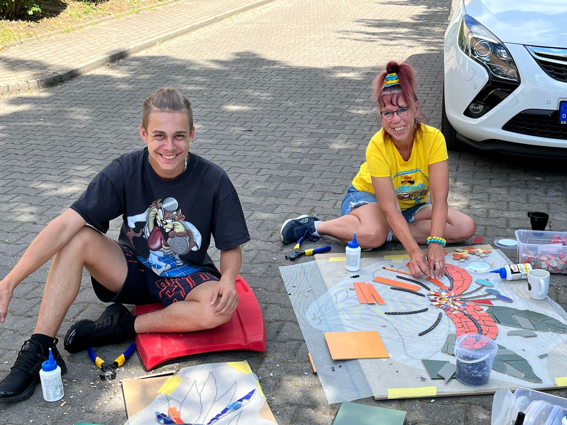 Die Mitarbeiterinnen vom Stadtteilbüro und Frau Müllers waren als Helferinnen vor Ort . Sie zerlegten die sich noch am Boden in der Tiefgarage befindlichen Mosaike in Einzelteile und trugen diese dann zum Montagebereich. Am nächsten Tag haben wir alle fleißig verfugt. Wir waren ein tolles Montageteam. Alles lief reibungslos.