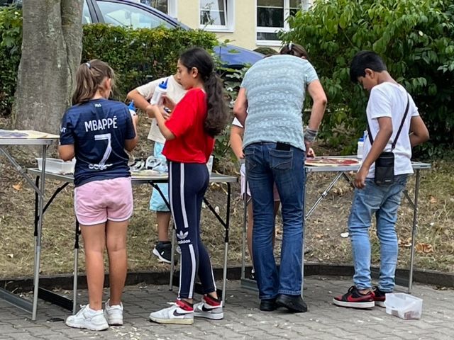 Die Immobiliengesellschaft Wagner stellte uns in der Tiefgarage eine Doppelgarage zur Verfügung in der wir uns einrichteten und den Riesenentwurf auf dem Boden ausbreiteten. Die Garage war sehr dunkel und wir konnten mit den Materialien innerhalb der Garage nochmal umziehen, da uns ein Mieter seine Garage an der Einfahrt zur Verfügung stellte, die wesentlich heller war. Das Stadtteilbüro bemühte sich um teilnehmende Anwohner und akquirierte Anwohner. Ein fester Trupp, zwei Anwohnerinnen nebst Kindern, waren stetig zugegen. Andere Helfer kamen mal sporadisch hinzu. Um den 10 %igen Anteil der Eigenleistung des Förderbetrages zusammenzubekommen, stellte das Stadtteilbüro und ich jeweils einen Helfer:In.